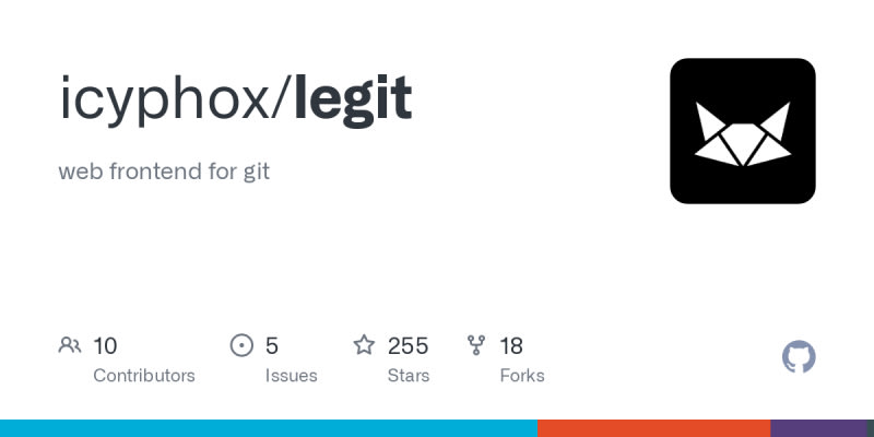 Legit is a git web frontend written in Go that features fully customizable templates and stylesheets, cloning over HTTP(s), and improved HTML. It uses yaml for configuration with options for specifying repository paths, readme files, main branches, and more.