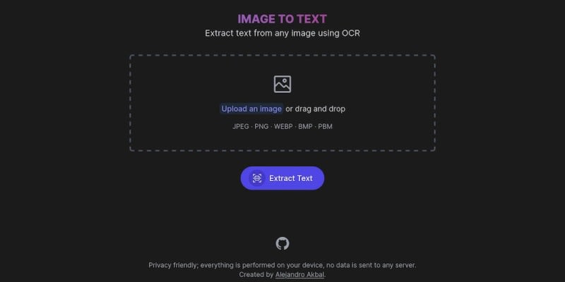 OCR A utility website for extracting text from any image using OCR. Made for those moments where you take a photo of some text and wish you could have it digitally. Everything is performed on your device, no data is sent to any server.