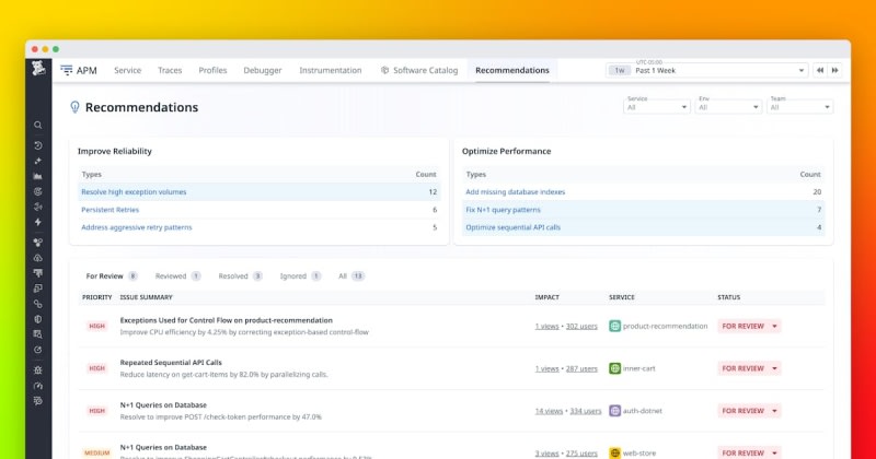 Detect emerging performance and reliability issuesTriage recommendations and assign ownership with full contextTrack ongoing recommendations across teams and environmentsImprove application performance and reliability proactively with APM RecommendationsSort: