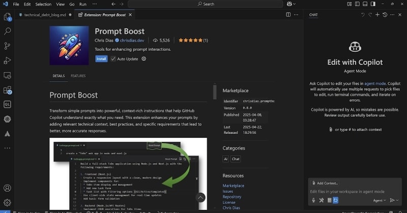 Prompt Boost is a VS Code extension that automatically transforms basic prompts into comprehensive, context-rich instructions for GitHub Copilot and other AI coding assistants. The extension enhances simple requests like 'Create a login component' into detailed specifications including technical requirements, best practices,