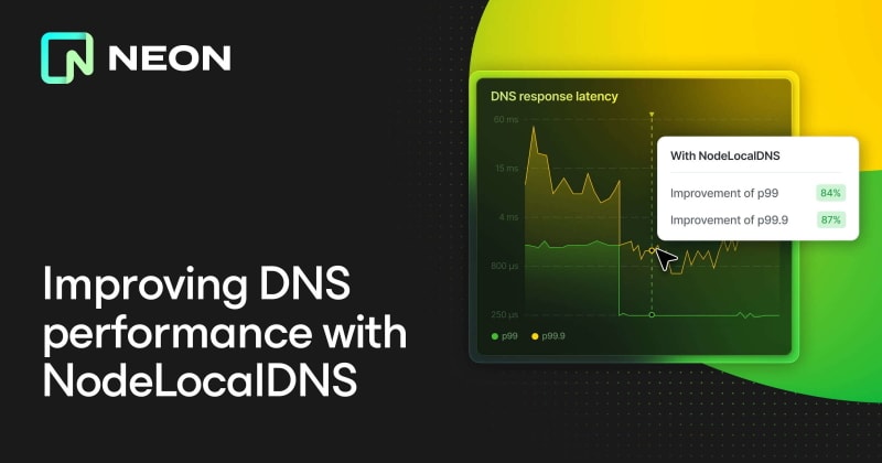 Neon deployed NodeLocalDNS across their Kubernetes clusters to optimize DNS performance for hundreds of thousands of ephemeral Postgres databases. By caching DNS requests locally on each node instead of routing them to central CoreDNS pods, they achieved an 84% reduction in 99th percentile latency and 87% improvement in 99.9th