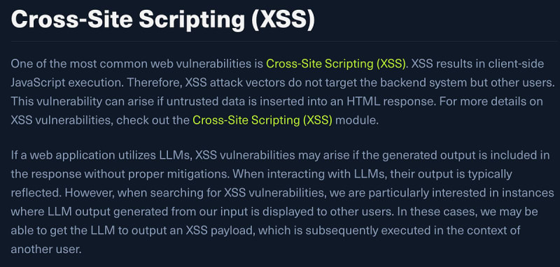 LLM-powered applications reintroduce XSS vulnerabilities through insecure output handling (OWASP LLM05). When model output is inserted into the DOM without encoding, attackers can craft prompts that cause the LLM to generate malicious HTML or script tags, bypassing input sanitization. Two attack scenarios are covered: reflected