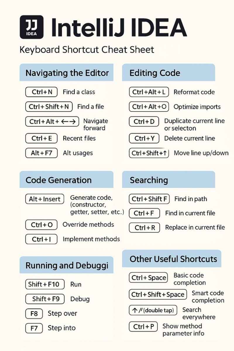 A comprehensive guide featuring keyboard shortcut cheat sheets for both IntelliJ IDEA and Eclipse IDEs, specifically designed for Java developers. The post emphasizes the importance of mastering IDE tools to become a more productive developer and includes recommendations for online courses to deepen IDE skills. It covers