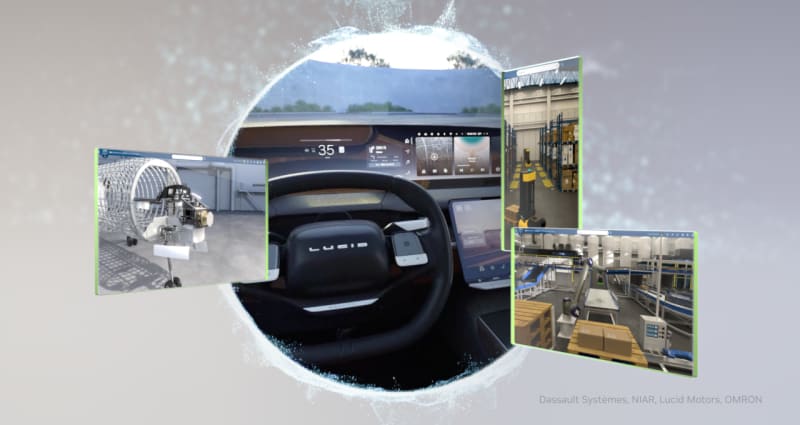 NVIDIA and Dassault Systèmes have announced a partnership integrating Dassault's Virtual Twin platforms with NVIDIA accelerated computing, CUDA-X, and Omniverse libraries. The collaboration enables physics-based AI simulations for industries including automotive (Lucid Motors), life sciences (Bel Group food proteins),