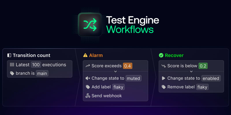 Buildkite Test Engine now includes workflows, a feature that automatically detects flaky tests using configurable monitors (transition count, passed on retry, probabilistic flakiness) and triggers custom actions like labeling, muting, sending notifications to Slack, or creating Linear issues. Teams can apply tag filters to