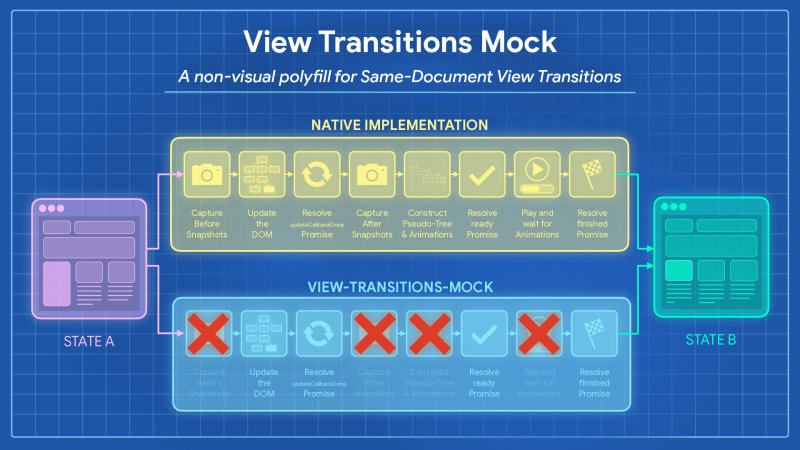 view-transitions-mock is a non-visual polyfill for the Same-Document View Transitions API, created to eliminate the need for defensive browser-support checks in your code. It implements the full JavaScript API surface of the View Transition spec (including ViewTransition promises, transitionRoot, activeViewTransition, and View