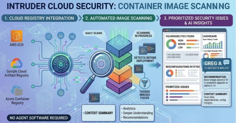 Intruder has expanded its cloud security platform with agentless container image scanning, integrating directly with AWS ECR, Google Cloud Artifact Registry, and Azure Container Registry. The feature performs daily vulnerability scans without requiring agent deployment or complex engineering tooling, targeting midsize