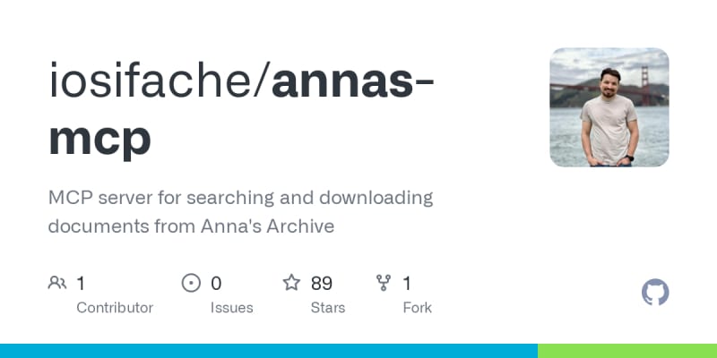 An MCP (Model Context Protocol) server that enables searching and downloading documents from Anna's Archive through API integration. The tool provides search and download functionality, requires an API key obtained through donation, and can be configured with Claude Desktop or other MCP clients. Users need to set up environment variables for the API key and download path.