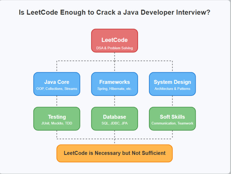 LeetCode is an excellent tool for sharpening your problem-solving skills, but it's not sufficient to crack a Java developer interview by itself. Apart from algorithmic skills, candidates need to master core Java fundamentals, have a deep understanding of the Java ecosystem, become proficient with Spring Boot, and be able to