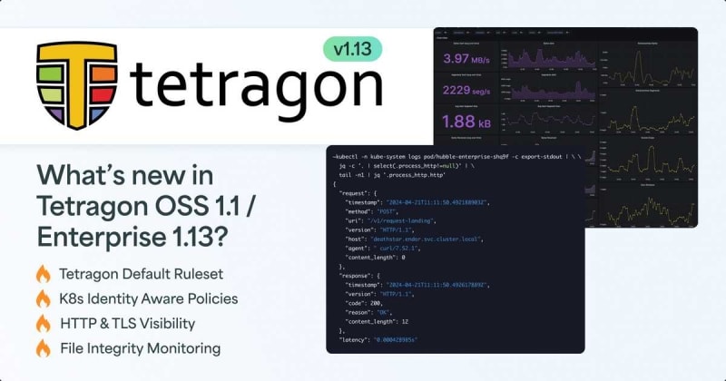 Isovalent Enterprise for Tetragon 1.13 introduces new features such as Kubernetes Identity Aware Policies, Tetragon Default Ruleset, Sandbox Policies, Redaction filters, File Integrity Monitoring (FIM), Privilege Escalation and Kernel CVEs Protection, HTTP Visibility, TLS Visibility, OpenShift Support, and Labels for Prometheus Metrics.