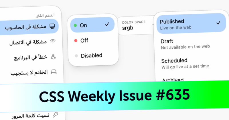 CSS Weekly Issue #635 curates recent CSS content including tutorials on the @scope rule for maintainable styling, CSS-only elastic text effects, creating interactive Pantone color decks with native HTML elements, and semantic pie charts without JavaScript. Also features Chrome DevTools tips for targeting elements in the