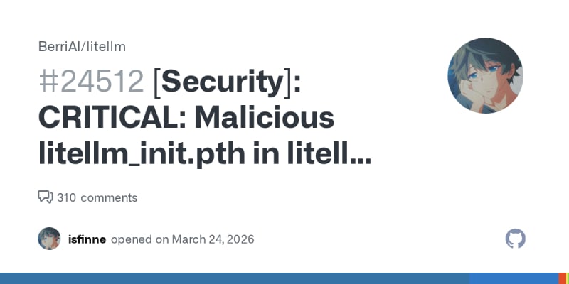 A critical security vulnerability was discovered in litellm version 1.82.8 on PyPI. The wheel package contains a malicious .pth file (litellm_init.pth) that automatically executes a credential-stealing script every time Python starts — no import required. The payload is double base64-encoded and performs extensive data collection including environment variables, SSH keys, AWS/GCP/Azure credentials, Kubernetes configs, Docker configs, shell history, crypto wallets, and CI/CD secrets. Collected data is AES-256 encrypted, RSA-wrapped, and exfiltrated to an attacker-controlled domain (models.litellm.cloud). Anyone who installed this version should immediately rotate all credentials and check for the malicious .pth file in their site-packages directory.
