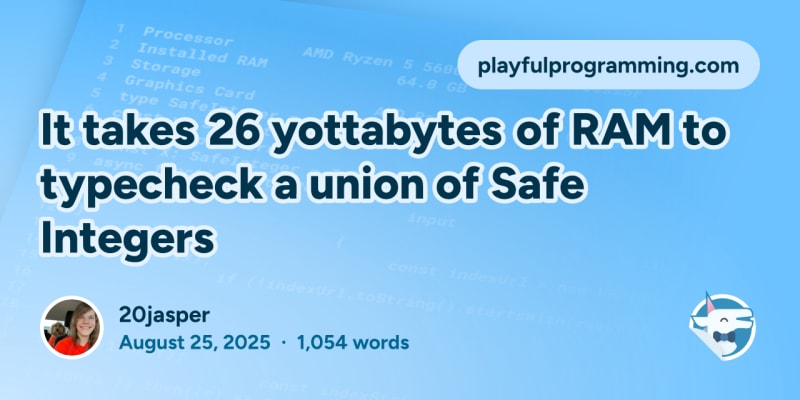 A fun benchmark exploring what happens when you try to typecheck a TypeScript union of all JavaScript Safe Integers (from Number.MIN_SAFE_INTEGER to Number.MAX_SAFE_INTEGER). The full union file would be ~315 zettabytes, and typechecking it with TSC would theoretically require 26 yottabytes of RAM. Benchmarks compare TSC vs TSGO (the upcoming Go-based TypeScript compiler): TSGO is ~1000x faster for this use case, though it would still need ~22 yottabytes of RAM. RAM usage scales linearly with file size, and TSC pegged a single CPU core at 100% while TSGO used ~150% across cores.