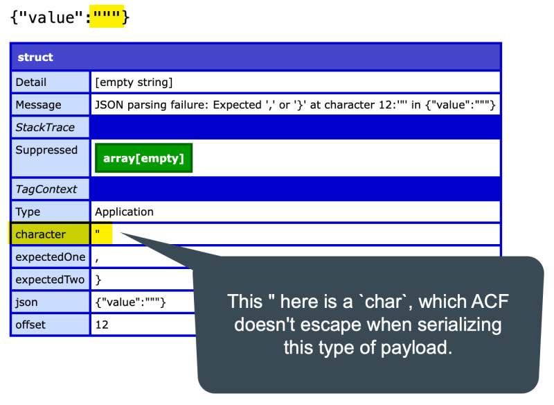 A bug in Adobe ColdFusion 2025 causes improper JSON serialization of `java.lang.Character` values. When a struct contains a `char` type (e.g., a double-quote character via `javaCast("char", '"')`), `serializeJson()` fails to escape it correctly, producing malformed JSON that `deserializeJson()` cannot parse. The bug creates a