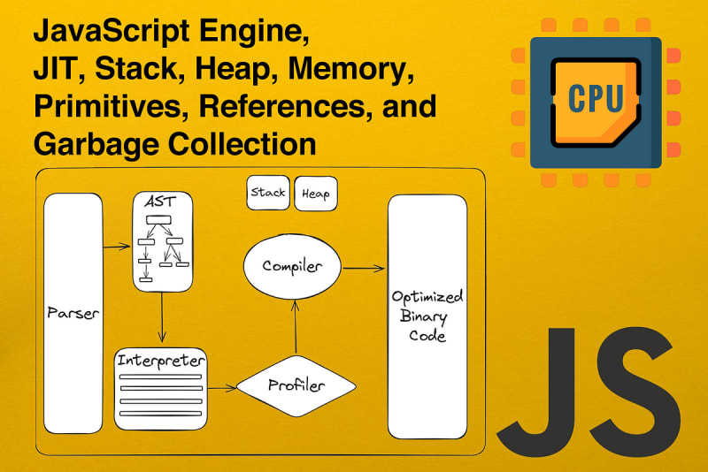 JavaScript Engine, JIT compiler, Stack, Heap, Memory, Primitives, References, and Garbage Collection