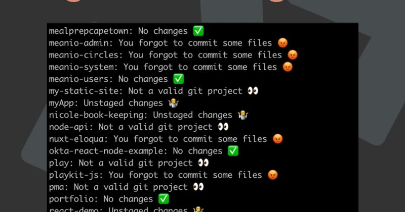Bash git commit prompt script. It will loop through our project directory and tell us the following statistics per project: Is it a git repo? Did you forget to commit something? Do we have unstated changes? If it's not a git project we change our message. If we run our bashsh script, we will get all lines per project folder with the status.