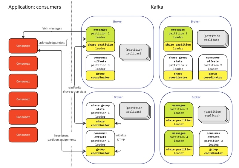 Explore the characteristics and limitations of consumer groups in Kafka, learn about the proposed share groups for cooperative consumption, and discover the KMQ pattern for individual message acknowledgements.
