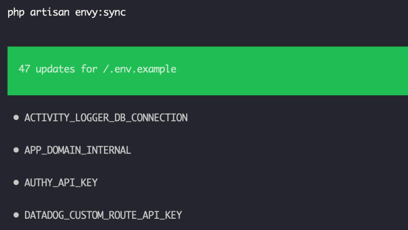 Envy is a Laravel package that checks your .env.example file for missing environment variables. It is not a sync-up between .env and.example files. It reads all of your project's config files (or any other files you've configured) and finds calls to the env function. Then, it compares those calls to what's contained inside