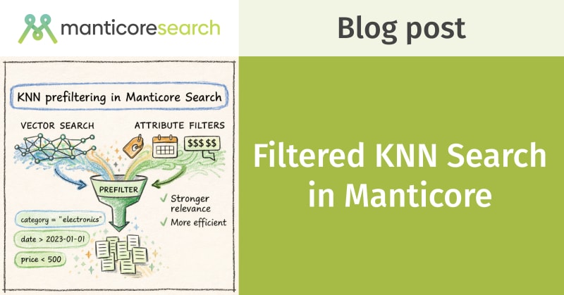 KNN prefiltering in Manticore Search (available from v19.0.1) integrates attribute filters directly into HNSW graph traversal rather than applying them after the fact. Postfiltering can return fewer results than requested when filters are selective, while prefiltering guarantees k results. Manticore uses three strategies