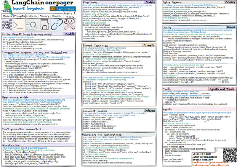 LangChain Cheatsheet — All Secrets on a Single PageModelsPromptsIndexesMemoryChainsAgents and ToolsReminder: You can download the PDF version , check out onepagers on GitHub , and launch the code in Colab .1 Comment