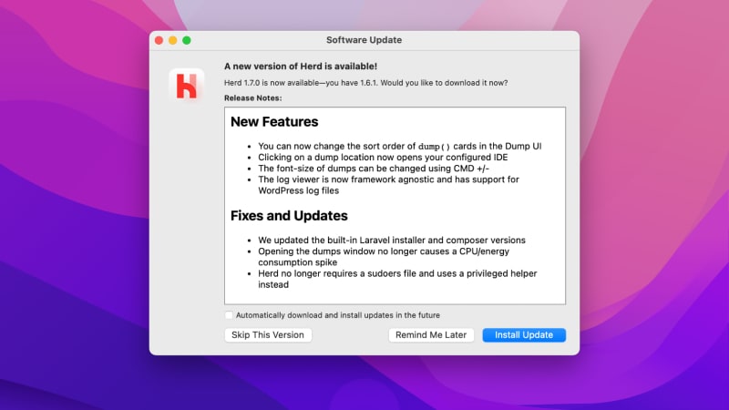 Laravel Herd v1.7 is now out with updates to the dump UI. You can change the sort order of dump() cards, open your configured IDE by clicking on a dump location, and change the font size of dumps.