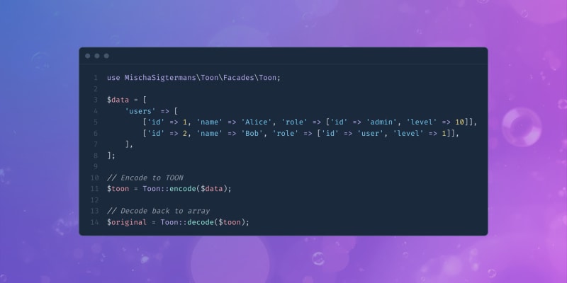 Laravel TOON is a package that reduces LLM token usage by 40-60% through intelligent data serialization. It flattens nested JSON objects into a compact YAML-like format using dot notation, eliminating repeated keys, braces, and quotes. Real-world benchmarks show savings of ~2,200 tokens per 50-record response. The package