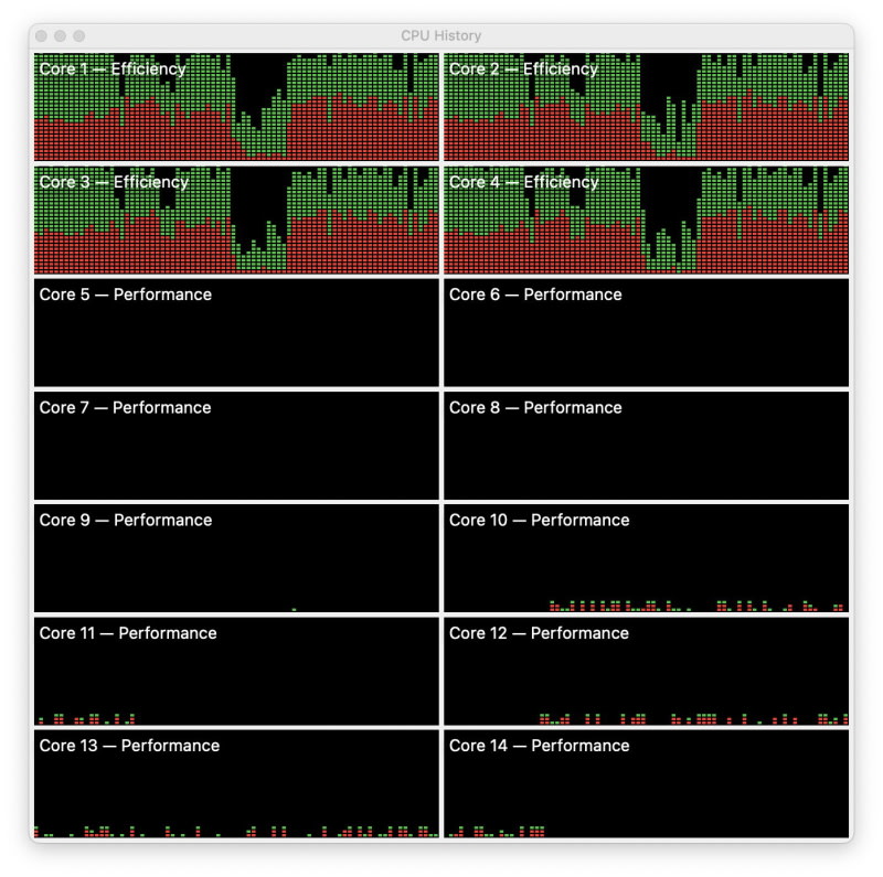 Apple silicon Macs achieve superior performance by using Efficiency cores to handle background processes, keeping Performance cores available for user applications. The architecture leverages Quality of Service (QoS) metrics to segregate foreground threads (which run on P cores) from background threads (restricted to E cores).