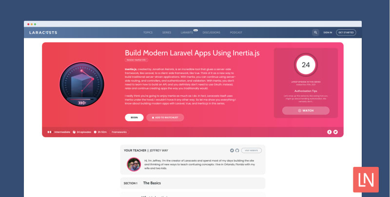 The series is free, covering Inertia.js, the technology used in first-party Laravel packages such as Laravel Jetstream and Laravel Breeze. The series consists of 24 videos that teach you how to build single-page apps using Inerta.js.