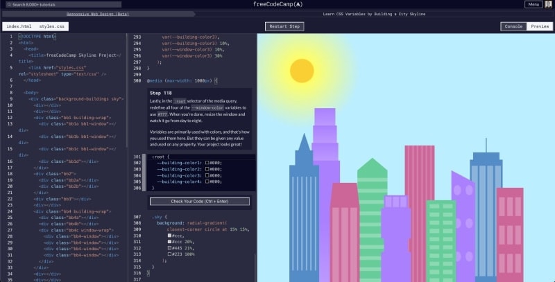 The Responsive Web Design Certification is the first of freeCodeCamp's 10 currently-live certifications. Instead of coding lessons, you'll learn concepts and syntax through a series of 15 practice projects + 5 certification projects. The full certification will take most web development beginners around 300 hours to complete.