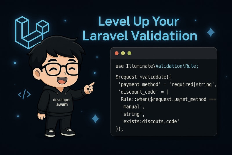 Laravel offers advanced validation techniques beyond basic rules like 'required' and 'email'. Five key methods include Rule::when() for conditional validation, bail to stop at first failure, asterisk notation for dynamic array validation, sometimes for optional field validation, and validated() method to safely retrieve only validated data instead of all input.