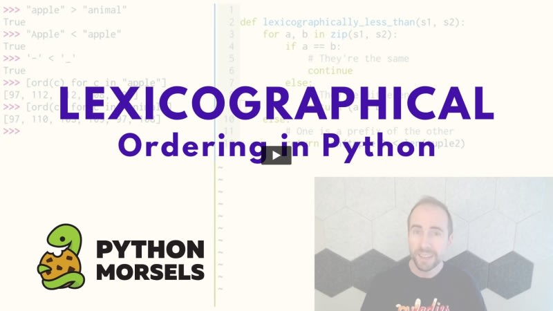 Lexicographical ordering in Python explains how strings, tuples, lists, and all sequences are compared element-by-element, similar to alphabetical ordering. Python uses Unicode code points to determine character order, meaning uppercase letters sort before lowercase. The comparison works by finding the first differing element;