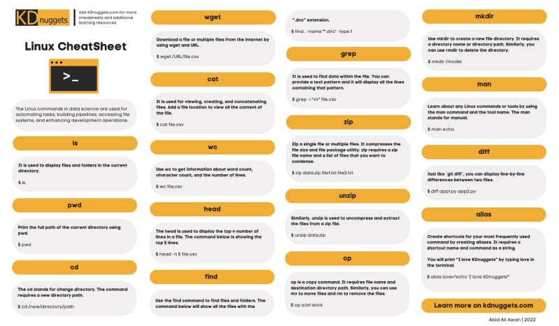 Linux for Data Science Cheatsheet KDnuggets is back with a Linux quick reference for data science. The cheatsheet covers 16 of the most useful Linux terminal commands, enough to get you doing much of your day to day OS business from the command line.
