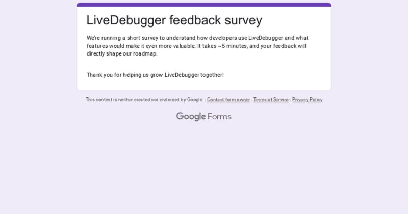 LiveDebugger is conducting a 5-minute feedback survey to understand how developers currently use their debugging tool and gather input on potential new features. The survey responses will directly influence the product's development roadmap.