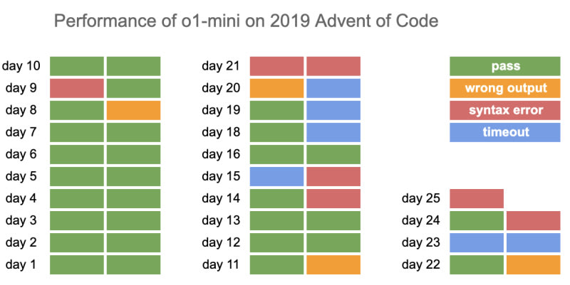 Advent of Code (AoC) is an annual coding competition. This post explores how OpenAI's o1-mini model performs remarkably well on AoC puzzles, solving 86% of the puzzles correctly and quickly. Using a robust test harness and standard prompts, the model succeeded where previous generations struggled. However, there's controversy
