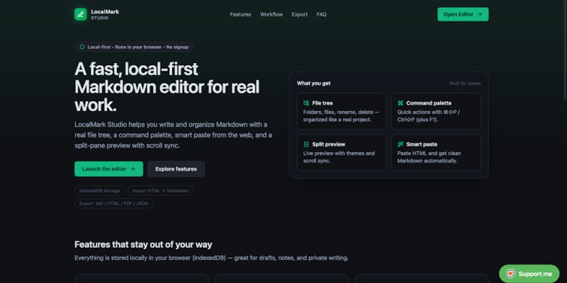 LocalMark Studio is a browser-based Markdown editor that stores notes locally using IndexedDB for privacy. Features include a file tree with folder management, command palette (⌘⇧P/Ctrl⇧P), smart HTML-to-Markdown paste conversion, split-pane live preview with scroll sync, and optional support for Mermaid diagrams and KaTeX math rendering.
