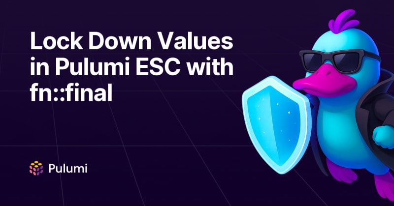 Pulumi ESC introduces fn::final, a built-in function that lets you mark configuration values as immutable in parent environments. When a child environment attempts to override a value marked with fn::final, ESC raises a warning and preserves the original value, preventing accidental or unauthorized changes to security policies and compliance settings.