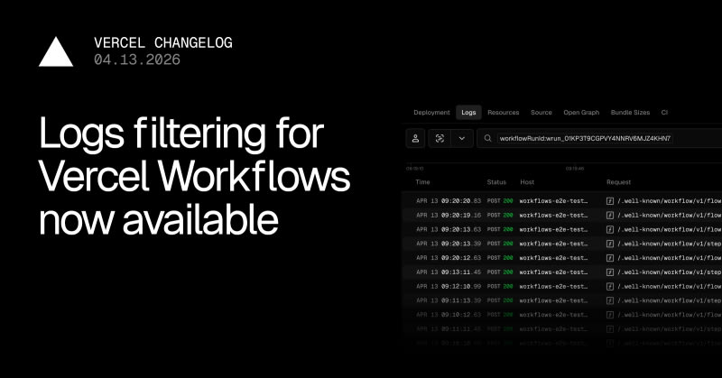 Vercel now supports filtering workflow run logs, allowing developers to view all logs associated with a workflow run in one place. From the workflow run details page, a 'View Logs' button jumps directly to the Logs tab, where logs can be filtered by Workflow Run ID and Workflow Step ID. This complements existing run-level