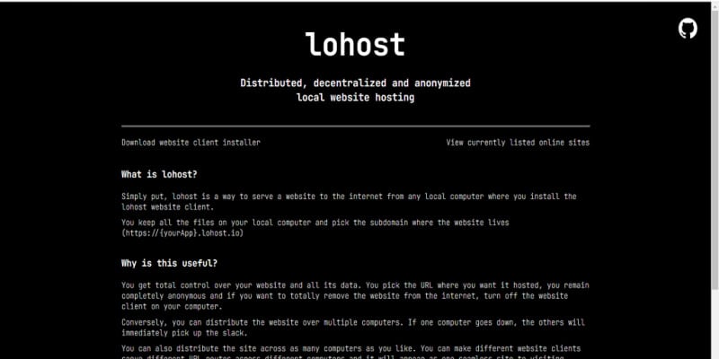 Lohost is a way to serve a website to the internet from any local computer where you install the lohost website client. You keep all the files on your local computer and pick the subdomain where the website lives (https://{yourApp}.lohost.io)