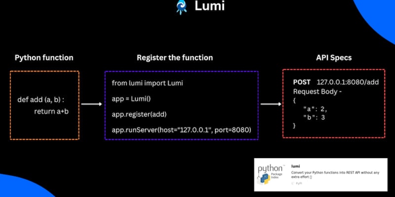 Lumi is a nano framework to convert python functions into a REST API. The toolkit made for Makers Launch Guide Checklists and pro tips for launching Jobs About us Ambassadors Careers Apps FAQs. Lumi was hunted by Tanmoy Sarkar in Productivity.