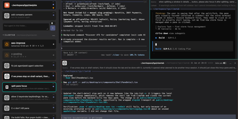 ClawTab is a macOS desktop app designed to manage 20+ AI coding agents running in parallel. It wraps tmux in a proper GUI interface, providing a sidebar showing per-agent query, model, and start time, along with pane splitting, auto-yes for unattended runs, and remote control from a phone. It supports Claude Code, Codex, and OpenCode.