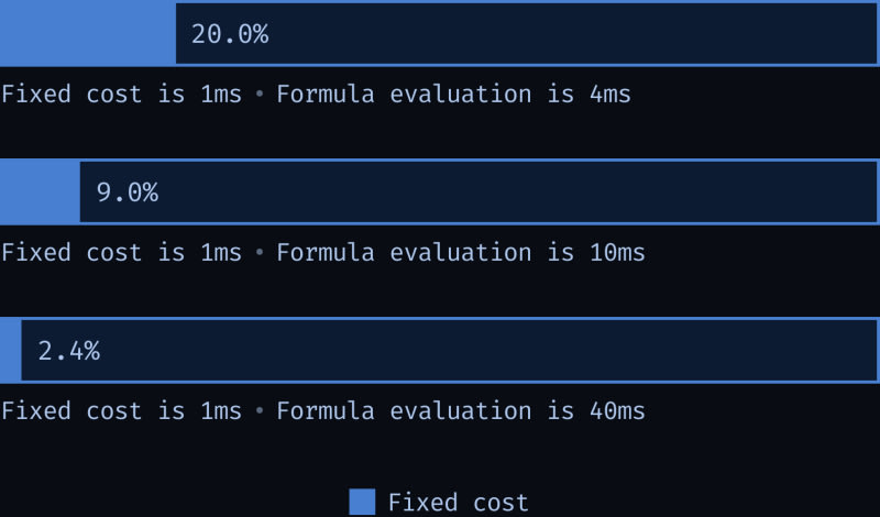 A deep dive into optimizing a browser-based spreadsheet engine by reducing the fixed cost of cell recalculation. The bottleneck was a method called `_makeCalcCellEvaluationContext` consuming 12.5% of recalculation time by eagerly constructing a large evaluation context object for every cell. The fix involved two techniques:
