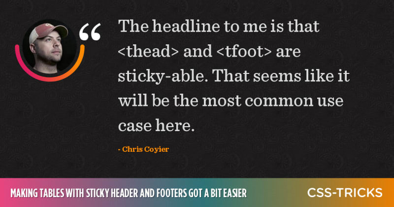 Chromium revamps tables in the rendering engine in Chromium, bringing tables up to speed. It’s not just the stickiness that was fixed, but all sorts of things. The headline to me is that <thead> and <tfoot> are sticky-able.