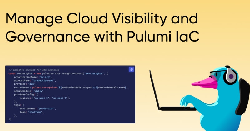 Pulumi Service Provider introduces new resources for discovering cloud resources across AWS, Azure, GCP, Kubernetes, and OCI environments, including those not managed by IaC. The InsightsAccount resource enables automated scanning and discovery, PolicyGroup organizes resources for compliance enforcement in audit or preventative