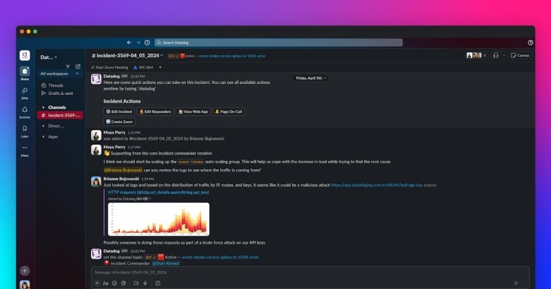 Learn how the Datadog Slack integration simplifies incident management, minimizes context-switching, and facilitates collaboration for DevOps, SREs, and security teams. Discover how to put a coordinated response in motion with a single message, keep stakeholders informed, and document incidents for postmortem analysis.
