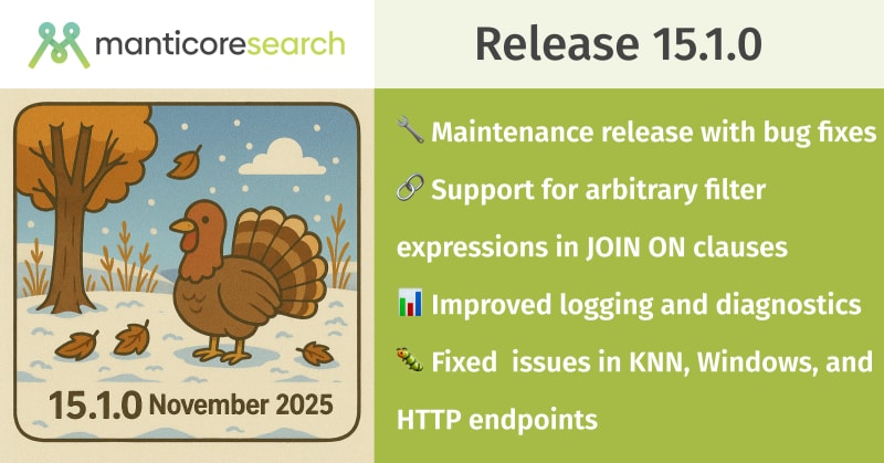 Manticore Search 15.1.0 is a maintenance release featuring bug fixes and minor improvements. The update includes MCL 9.0.0 with enhanced columnar storage (uncompressed float-vector storage, modified KNN vector block sizes, and non-buffered reads), though this changes the data format making it unreadable by older MCL versions.