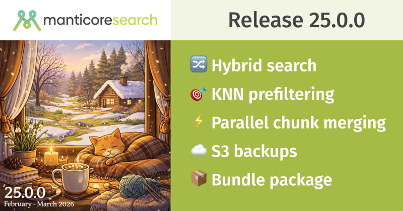 Manticore Search 25.0.0 is released with several major improvements. The packaging model is simplified into a single `manticore` bundle package for deb/rpm. Key new capabilities include hybrid search combining full-text and vector retrieval in a single query, KNN prefiltering that applies attribute filters during vector search