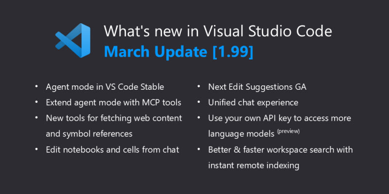 The March 2025 release of Visual Studio Code (version 1.99) introduces numerous updates including the availability of agent mode in VS Code Stable, Model Context Protocol server support, and several new built-in tools for agent mode. The update also enhances AI-powered editing for notebooks, improves the Copilot status menu,