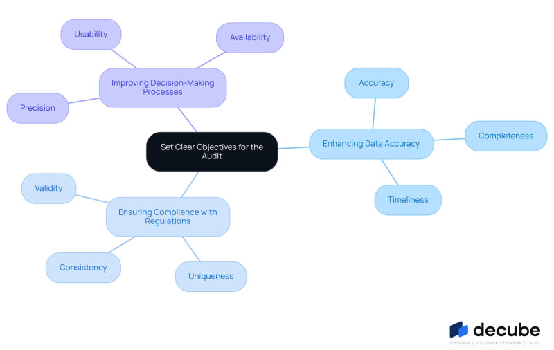 A structured guide covering nine steps for conducting a data quality audit, including setting clear objectives, selecting the right datasets, profiling data, establishing quality metrics (accuracy, completeness, consistency, timeliness, validity, uniqueness), documenting issues, developing remediation plans, and implementing