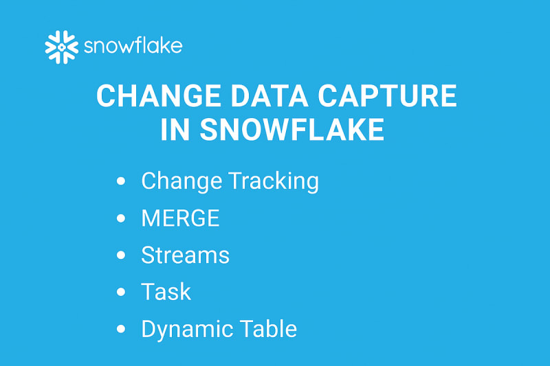 Comprehensive guide to implementing Change Data Capture (CDC) in Snowflake using five different approaches: Change Tracking for querying modifications over time intervals, MERGE operations for synchronizing data between tables, Streams for capturing table changes, Tasks for automating SQL execution on schedules, and Dynamic