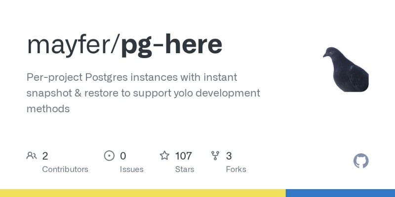 pg-here is a CLI tool and Node.js library that spins up a per-project local PostgreSQL instance with a single command (`bunx pg-here`). It stores the database in a `pg_local/` folder within the project directory, supports custom credentials, port, and PostgreSQL version, and provides instant snapshot and restore capabilities